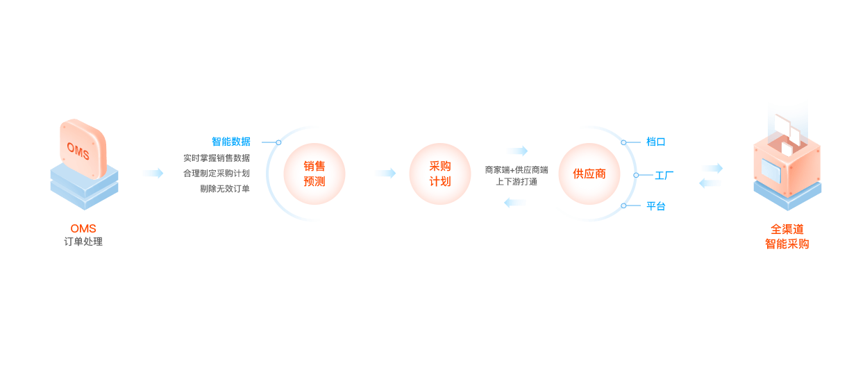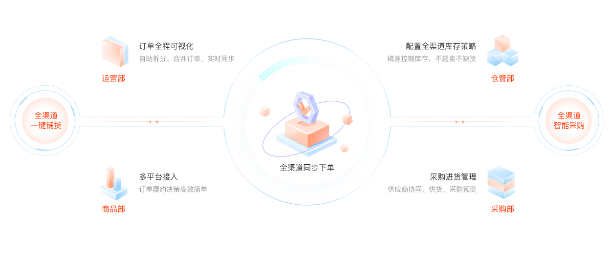 全渠道铺货、全渠道下单、全渠道采购,实现订单统一管理,店铺经营更高效